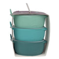 La tapa transparente permite ver el contenido y se puede etiquetar con lápiz o rotulador. Los tazones se enganchan y se apilan para guardarlos en el refrigerador o el congelador. La tapa abatible mantiene el tazón estable y los alimentos bien sellados para llevar.