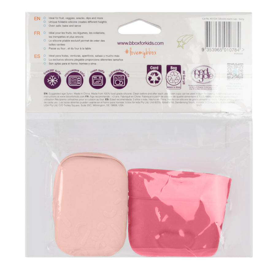 Este set de vasitos de silicona para snacks, están diseñados para adaptarse a las cajas de almuerzo B.Box, creando compartimentos adicionales para poder separar los alimentos. También puedes utilizar los dos juntos como una mini cajita para pequeñas porciones, snacks ó incluso, ¡como moldes para hornear muffins!