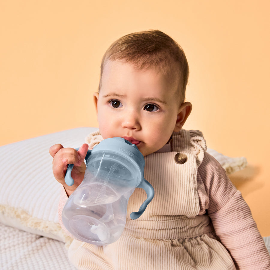 cualquier ángulo, independientemente de la inclinación del vaso. Se puede usar tumbado, lo que facilita la transición del biberón al vaso con pajita o para hidratarse después del baño.