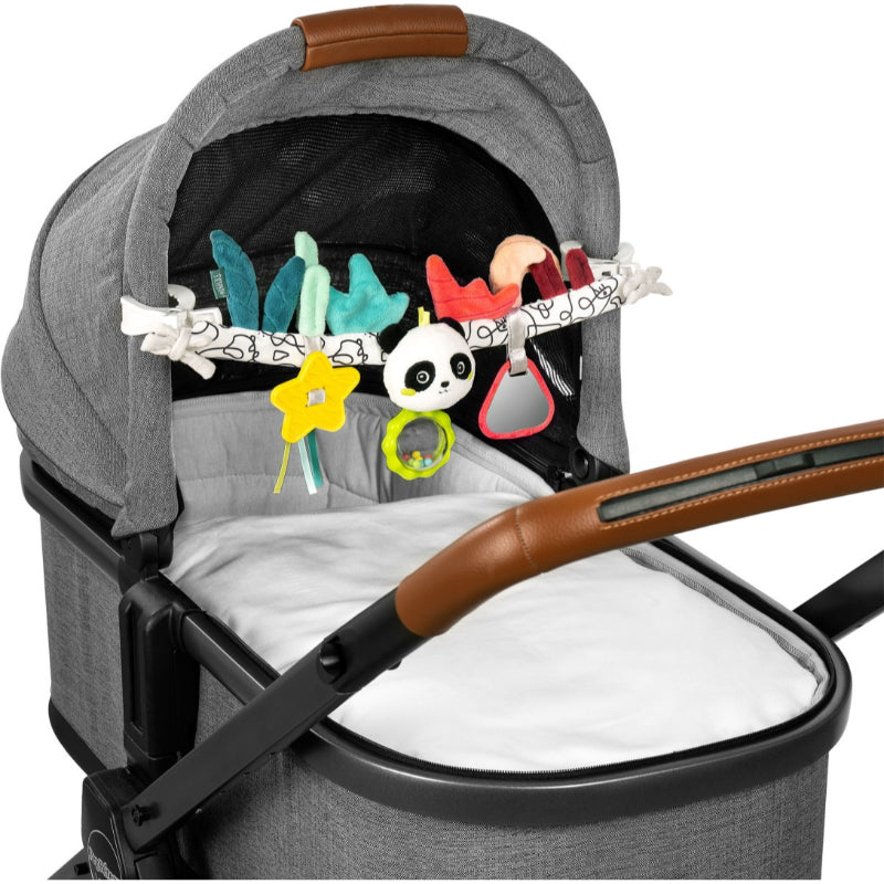 La cadena del cochecito garantiza buen humor y risas. El sonajero, el chirriador, el espejo y el papel crujiente fomentan la coordinación ojo-mano del bebé.