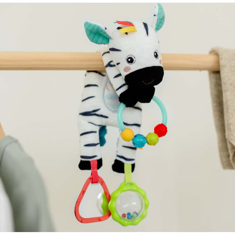 Este peluche deleita con los divertidos sonidos de la pelota sonajero, el chirriador y el crujido del papel. El aro de cuentas suena y anima a agarrar y explorar.