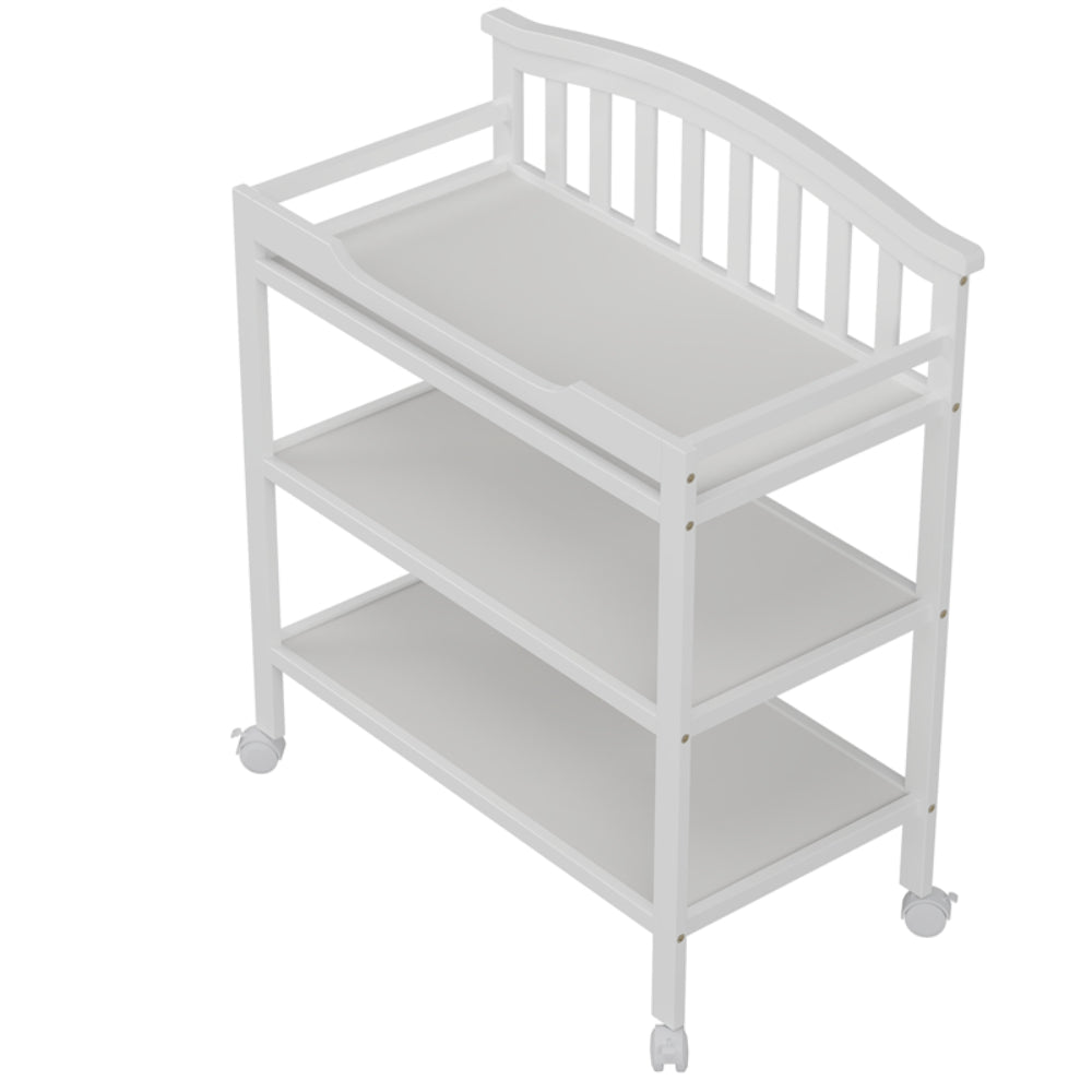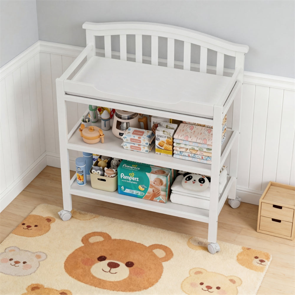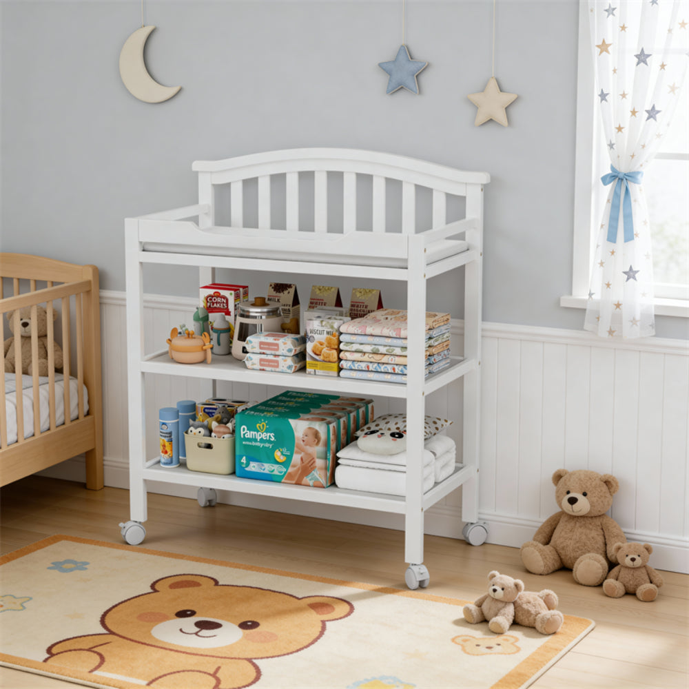 Capacidad de Almacenamiento: Dispone de tres niveles, incluyendo la parte superior para el cambio y dos estantes inferiores abiertos para tener a mano pañales, toallitas y otros artículos de aseo.