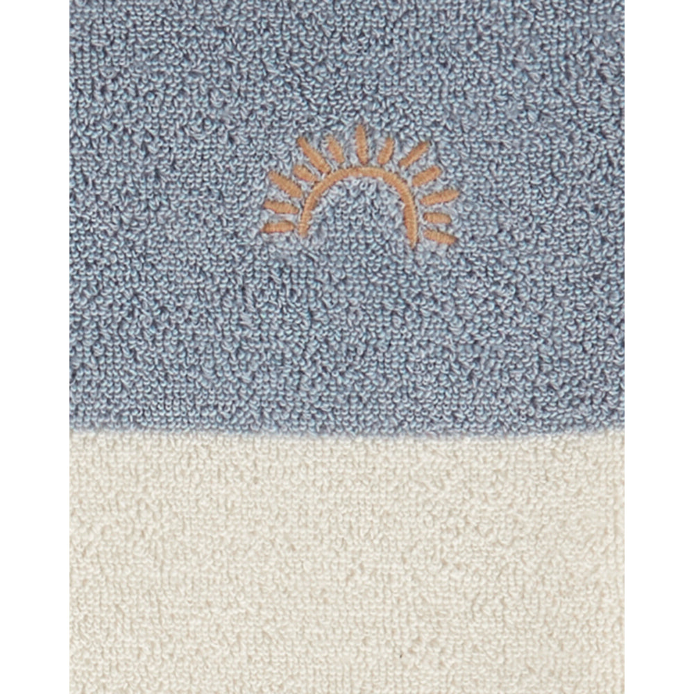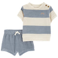 Incluye una camiseta de manga corta a rayas de color azul claro y crema combinada con pantalones cortos azules a juego, ambos confeccionados en suave tejido de rizo.