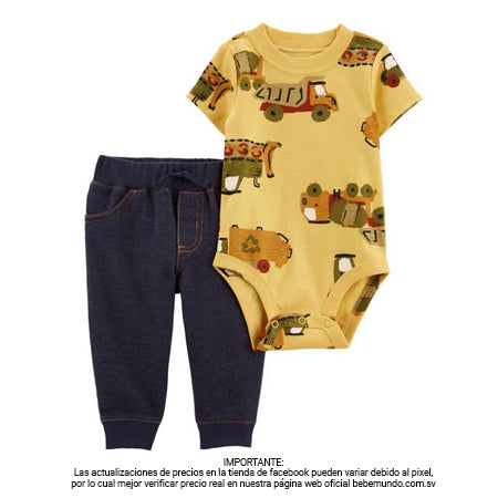 Dale al armario de tu niño un lindo conjunto de 2 piezas multicolor, es ligero y transpirable para que este en absoluta comodidad durante todo el día, incluye un mameluco diseño estampado, cuello redondo y mangas cortas, los broches en la parte inferior ayudan a cambiar fácilmente el pañal, además de pantalones estilo pants para un look completo. Genial como conjunto, se puede coordinar fácilmente con otras piezas de su armario para una apariencia linda.