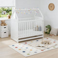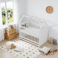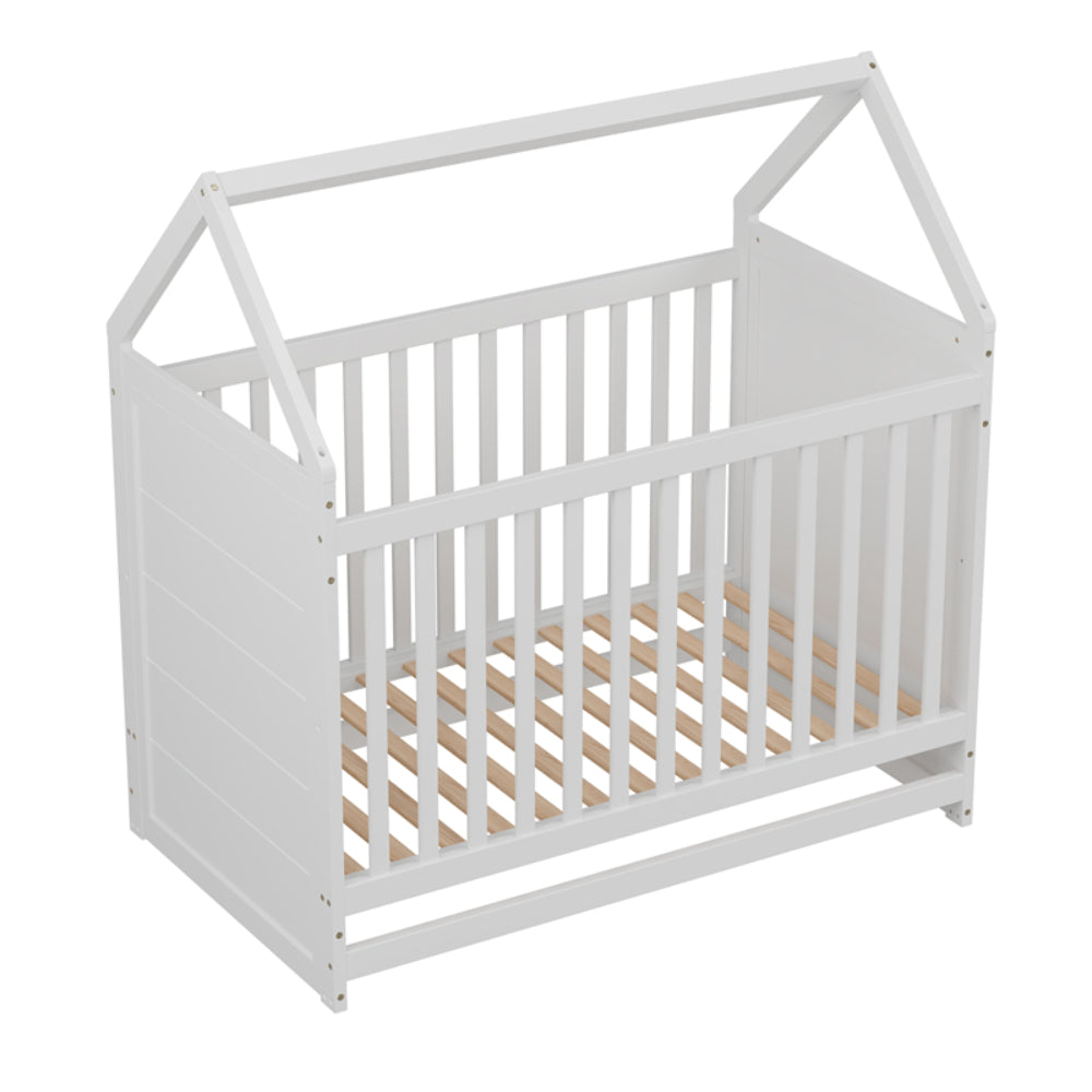 Es una estación integral 2 en 1 que ahorra espacio. Incluye un cambiador con tres cajones y estantes, una base de colchón ajustable en altura y la capacidad de transformarse en cama de transición conforme el niño crece.