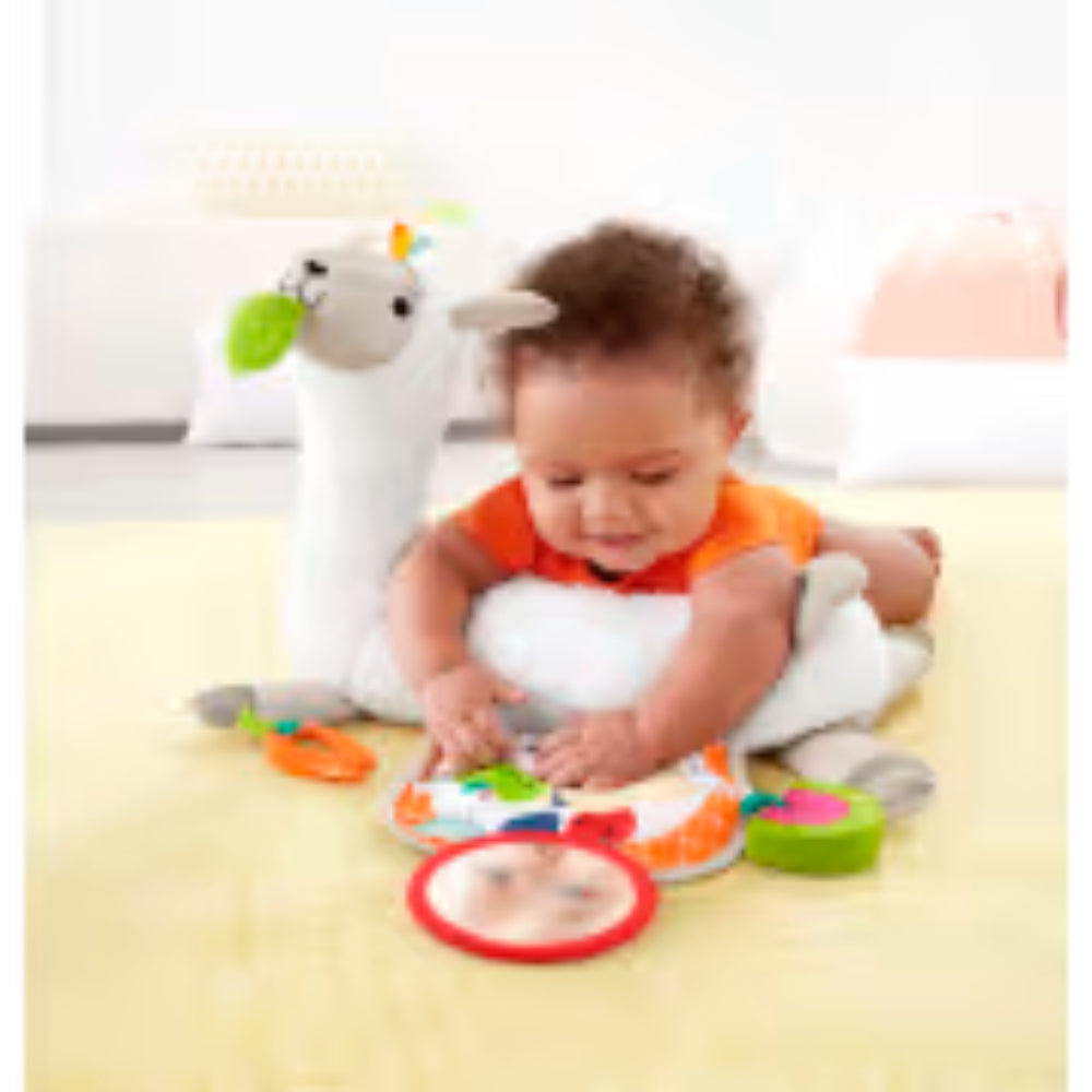 La llama Fisher-Price Grow-with-Me Tummy Time es un compañero de juego cómodo para tu bebé en crecimiento. La cuña de felpa sostiene a tu bebé a medida que crece, desde acostado boca arriba hasta empujándose en el tiempo boca abajo, sentado para jugar y jugando sobre la marcha. ¡La amigable llama viene con una manta de doble cara con un bolsillo para jugar a poner y tomar y tres juguetes, incluido un espejo que puedes colocar en la hoja en la boca de la llama o en la alfombra de juego! A tu pequeño explorador le encantará descubrir todas las emocionantes vistas, sonidos y texturas de este acogedor amigo llama. Donde el desarrollo entra en juego Sensorial: Una variedad de texturas para que tu bebé toque y dentelle ayuda a desarrollar sus habilidades táctiles mientras juega. Motricidad gruesa: Esta amiga llama ayuda a sostener a tu bebé mientras levanta la cabeza y se empuja hacia arriba durante el tiempo boca abajo, fortaleciendo los músculos del cuello y el torso. Autoidentidad: ¿Quién es esa monada? El espejo reposicionable ayuda a tu bebé a desarrollar un sentido de sí mismo mientras se mira en el espejo y descubre que esa dulce carita es la suya.