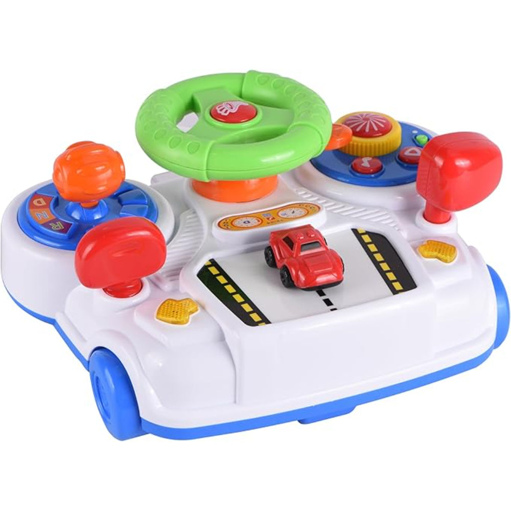 VOLANTE INFANTIL. Con distintas melodías y efectos de coche. Intermitentes, claxon y encendido. Además cuenta con cambio de marchas y retrovisor con espejo. Se sentirán como unos auténticos pilotos a la vez que pasan un rato entretenido y divertido.