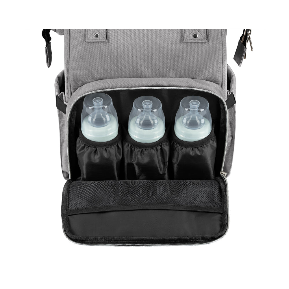 - Organización eficiente : incluye una amplia apertura principal con marco de metal para un acceso rápido y fácil, bolsillos organizadores para pañales y accesorios, y un bolsillo resistente al agua para artículos mojados.