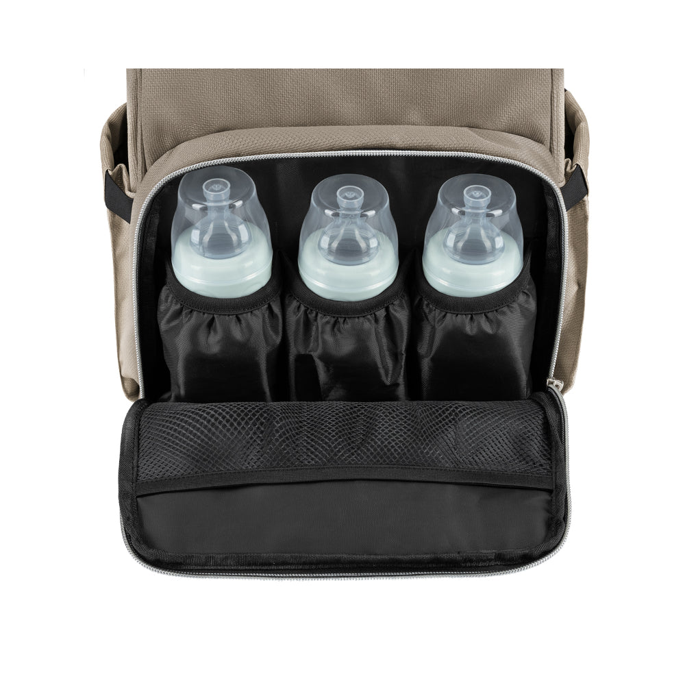 - Organización eficiente : incluye una amplia apertura principal con marco de metal para un acceso rápido y fácil, bolsillos organizadores para pañales y accesorios, y un bolsillo resistente al agua para artículos mojados.