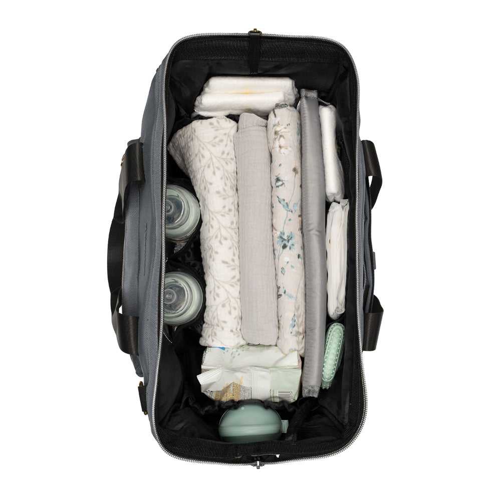 - Almacenamiento eficiente : cuenta con un espacioso bolsillo principal con una amplia apertura para un fácil acceso, compartimentos especializados para pañales y ropa, y múltiples bolsillos externos, incluidos bolsillos delanteros y traseros con cierre y bolsillos laterales para un acceso rápido.