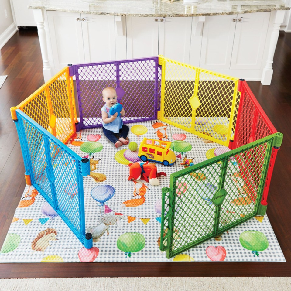 Ahora que tu bebé ya está en movimiento, crea un área de juego segura y divertida en cualquier lugar, ya sea adentro o afuera, con el colorido patio Toddleroo by North States® Superyard Colorplay.