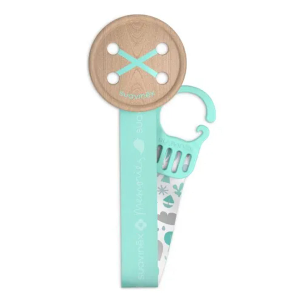El broche pinza con cinta, textil con diseño a doble cara, sujeta el chupete a la ropita evitando que caiga al suelo y se ensucie o pierda.